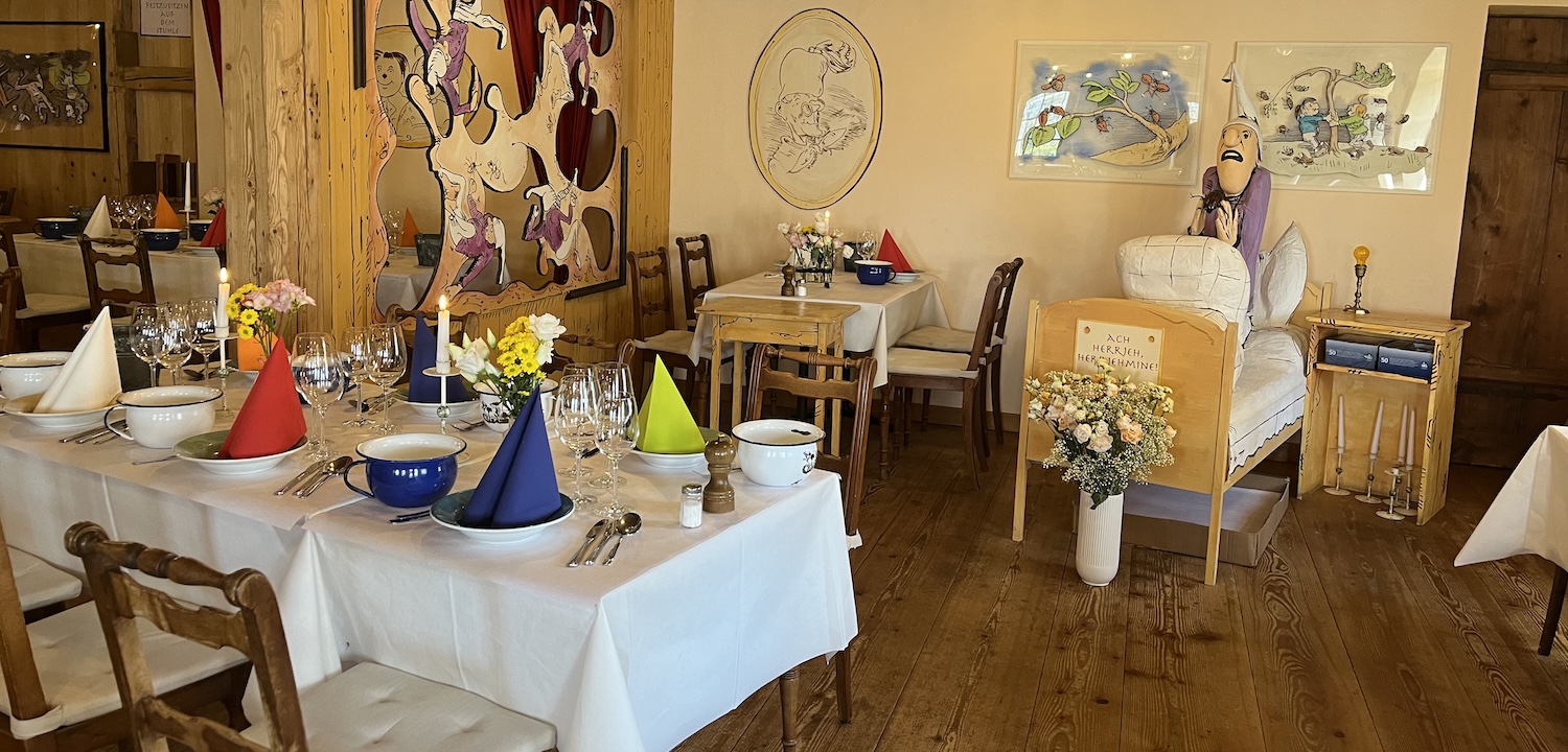 Der grösste Teil des Chnuschper-Hüsli's ist Onkel Fritzes Schlafzimmer - ja genau, der Ort an dem Onkel Fritz erwacht, als ihm die Maikäfer bei Nacht übers Bett kriechen. Dort können wir Ihnen eine schöne Bestuhlung bieten von 40-50 Personen. Dieser Teil befindet sich direkt an der Fenster-Front und lässt durch das einfliessende Licht, das altbelassene Holzgebälk, besonders schön erscheinen. Gerne kann die Bestuhlung in diesem Teil individuell mit uns besprochen werden.